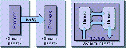 В последних версиях Perl появилась еще одна модель многозадачности - легковесные процессы (light-weight processes), называемые также потоками управления или нитями. (По-английски фраза "Perl threads" звучит как каламбур и может быть переведена как "нитки жемчуга" или "жемчужные ожерелья"). Нити отличаются от полновесных процессов с независимыми ресурсами тем, что выполняются в рамках одного процесса в единой области памяти. Поэтому создание нити происходит быстрее запуска отдельного процесса и требует меньше ресурсов операционной системы. Выполнение нитей в одной области памяти позволяет эффективно организовать совместный доступ к разделяемым данным. Кроме того, программист получает более полный контроль над параллельно выполняющимися потоками управления. Принципиальное различие между полновесными процессами, созданными операционной системой, и многопоточными нитями показано на рис. 16.1.