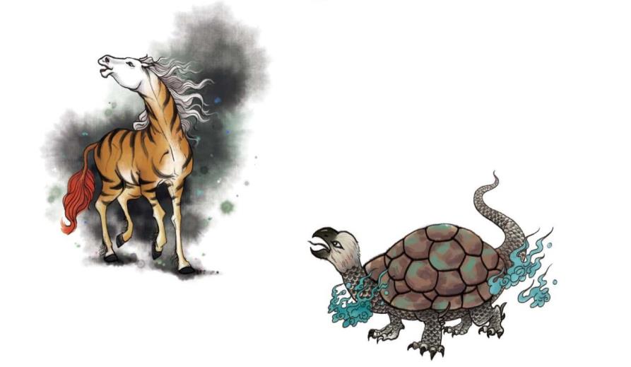 (1) Змея Фучун: в древних источниках – разновидность гадюки. У змеи есть клыки, её тело покрыто цветными полосками. Некоторые предполагают, что это щитомордник.