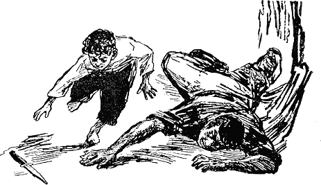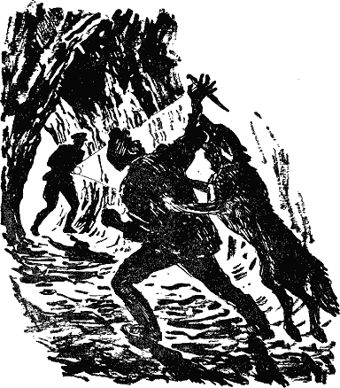 В пещере было двое людей. Один лежал на земле, другой, прижавшись к стене, размахивал ножом. Они, очевидно, только что проснулись. Нападение застало их врасплох.
